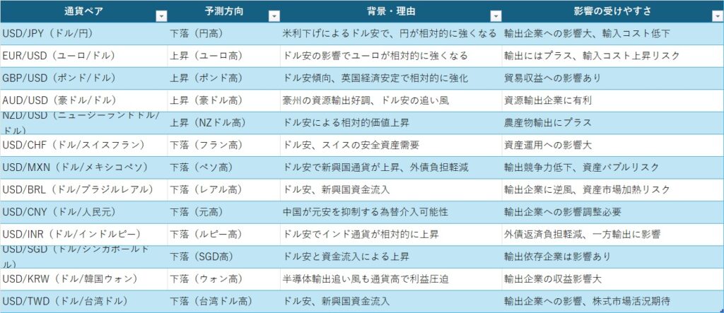 2025年9月の米国利下げ後の為替の値動き予測を整理して、主要通貨と新興国通貨を含めた表にまとめました。ドル安を中心に、日本円やユーロだけでなく、メキシコペソやスイスフランなども考慮しています。