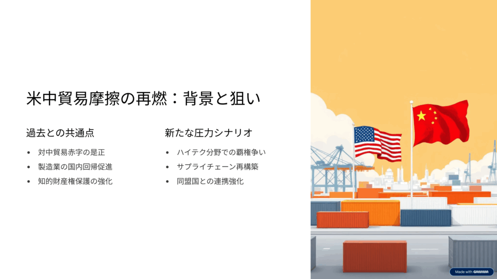 この関税発言は、2018〜2019年に激化した「米中貿易戦争」を思い出させる内容です。